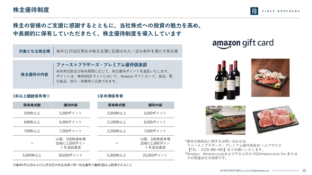株主優待についてはこれまでと変わらず株主のみなさまへの日頃のご支援に感謝すると共に、当社株式への投資魅力を高め、中長期的に保有いただけるよう「ファーストブラザーズ・プレミアム優待倶楽部」を導入しています。保有株数・期間に応じポイントを付与させていただいており、ポイントはAmazonギフト券などへ交換が可能です。