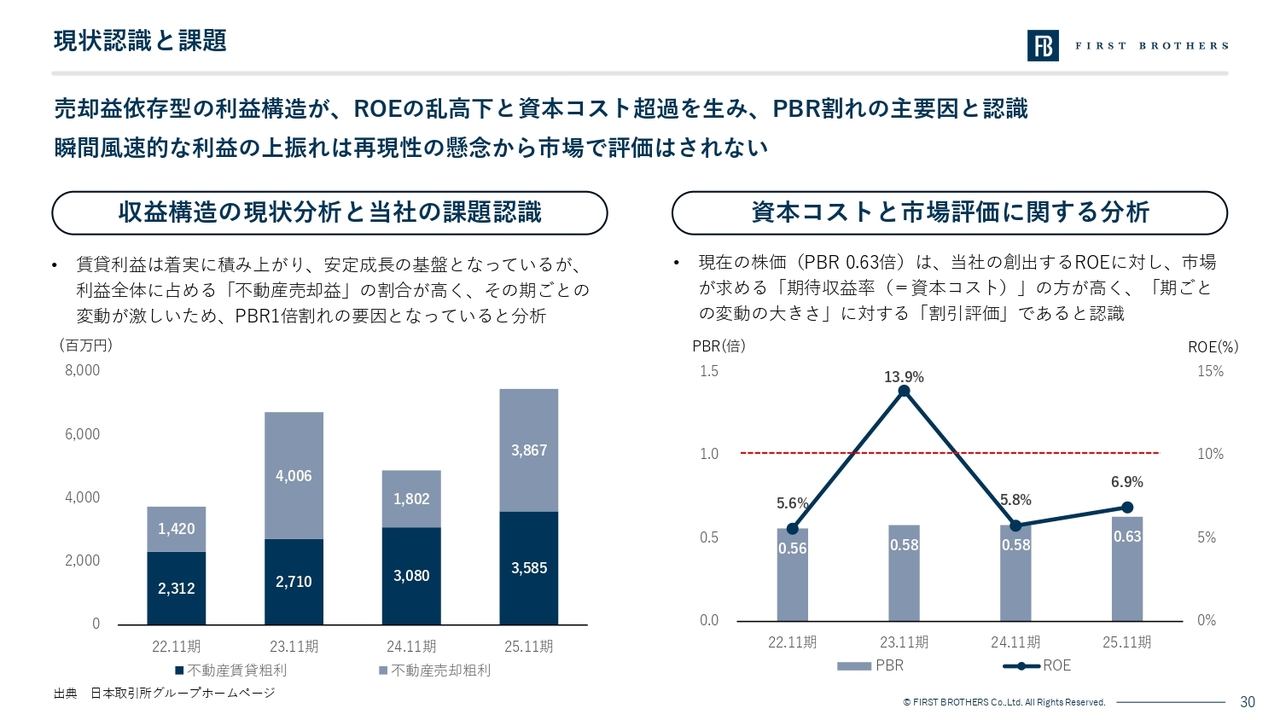 このギャップの主因は、資本コスト(期待収益率)の高止まりにあると分析しています。当社の特徴である売却タイミングによる利益の変動(ボラティリティ)に対し、株式市場が不確実性を感じ、その分だけ株価を割り引いて評価している(リスクプレミアムが高い)という現状認識です。つまり、稼ぐ力はあるものの、その再現性に対する市場の理解を得る努力が、まだ十分ではないと考えています。