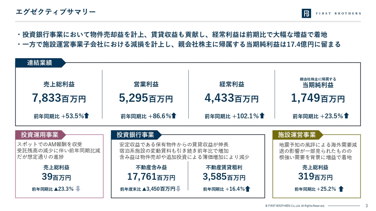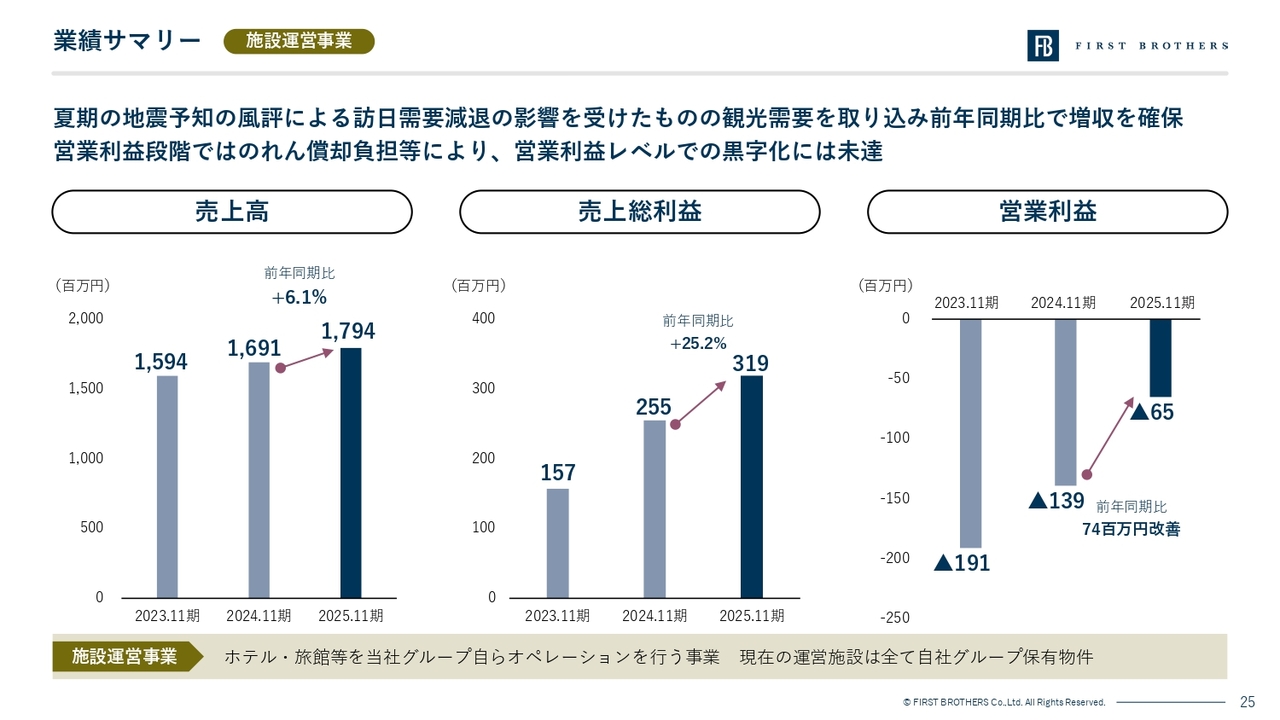 また、施設運営事業(ホテル運営)については、一部地域で地震予知に伴う風評等の影響を受けたものの、底堅いインバウンド需要を取り込み、売上総利益は約3.2億円(前期比25.2パーセント増)と大幅な増益を達成しています。
