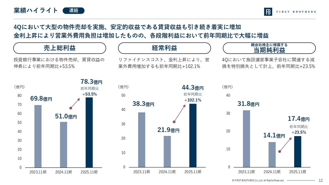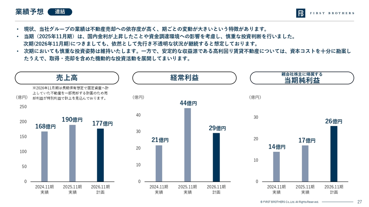 2026年11月期においては、固定資産として保有していた一部物件の売却を計画しています。会計上のルールにより、これらの売却益は経常利益には含まれず、その下の特別利益として計上される見込みです。そのため、経常利益は29億円となっていますが、ここには固定資産売却による利益が含まれていません。当社が創出する経済的価値の総量を正しく評価いただくためには、この特別利益を含んだ最終的なボトムライン、すなわち当期純利益を見ていただく必要があります。