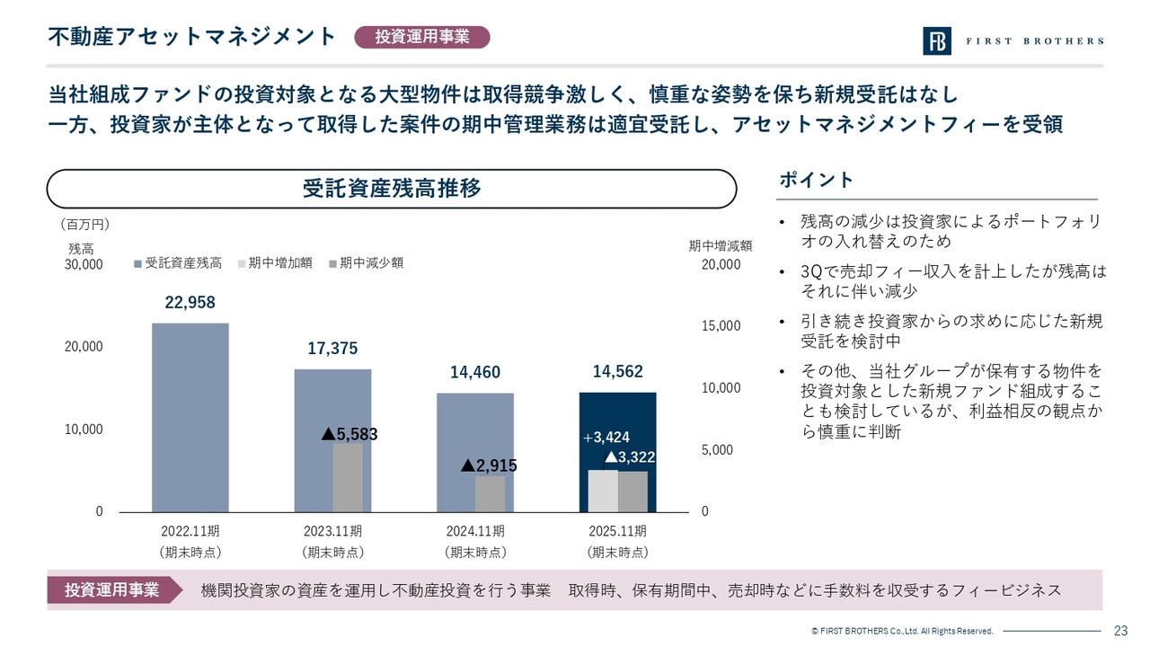 投資運用事業についてです。今期においては、金利上昇の影響や国外不動産の市況から投資家は慎重な取引姿勢となっており、当社としてもファンドでの取得はありませんでした。