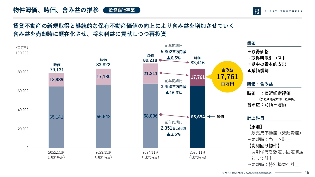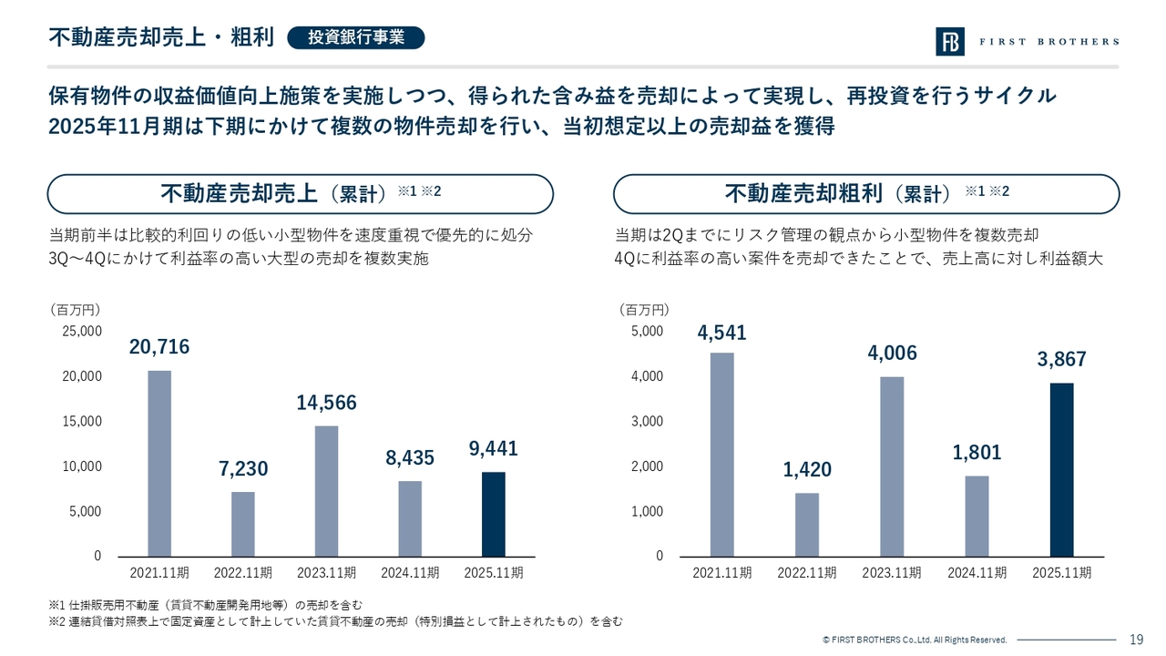 売却は売上高94.4億円、粗利38.6億円ですが、保有物件の収益価値向上施策を実施しつつ、得られた含み益を売却によって実現し、再投資を行うサイクルを実施しています。2025年11月期は下期にかけて複数の物件売却を行い、当初想定以上の売却益を獲得しました。