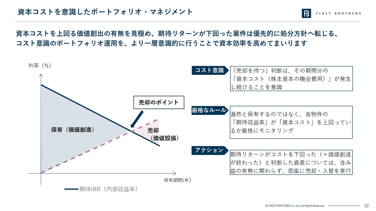 もし、ある物件の期待リターンがコストを下回った、つまり「これ以上保有しても、株主さまの期待するリターンを生めない(価値創造が終わった)」と判断した場合には、含み益の有無にかかわらず、即座に売却・入替えを実行します。