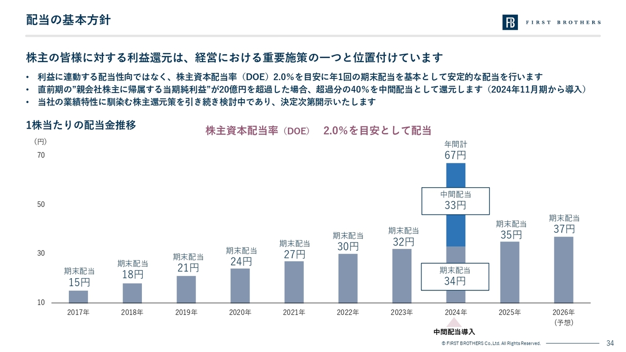 2026年11月期については、DOE2.0パーセントを基準に1株当たり37円の期末配当を実施する予定です。当社は今後も、株主資本の持続的な増加を通じて、株主のみなさまへの安定した利益還元を行っていきます。