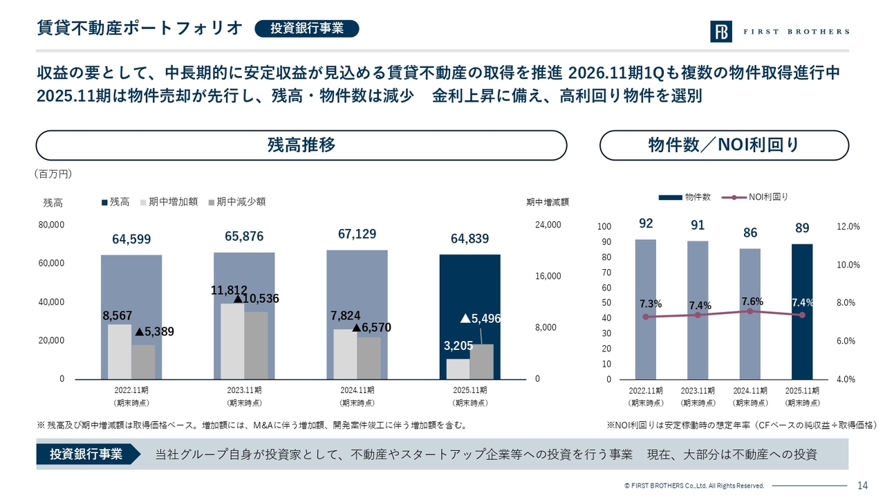 ここからは個別の事業についてご説明します。投資銀行事業では、中長期的に安定収益が見込める賃貸不動産ポートフォリオを構築しています。賃貸不動産は取得価格ベースで残高は648億円となりました。物件数は89物件で、NOIは7.4パーセントと高水準を維持しています。