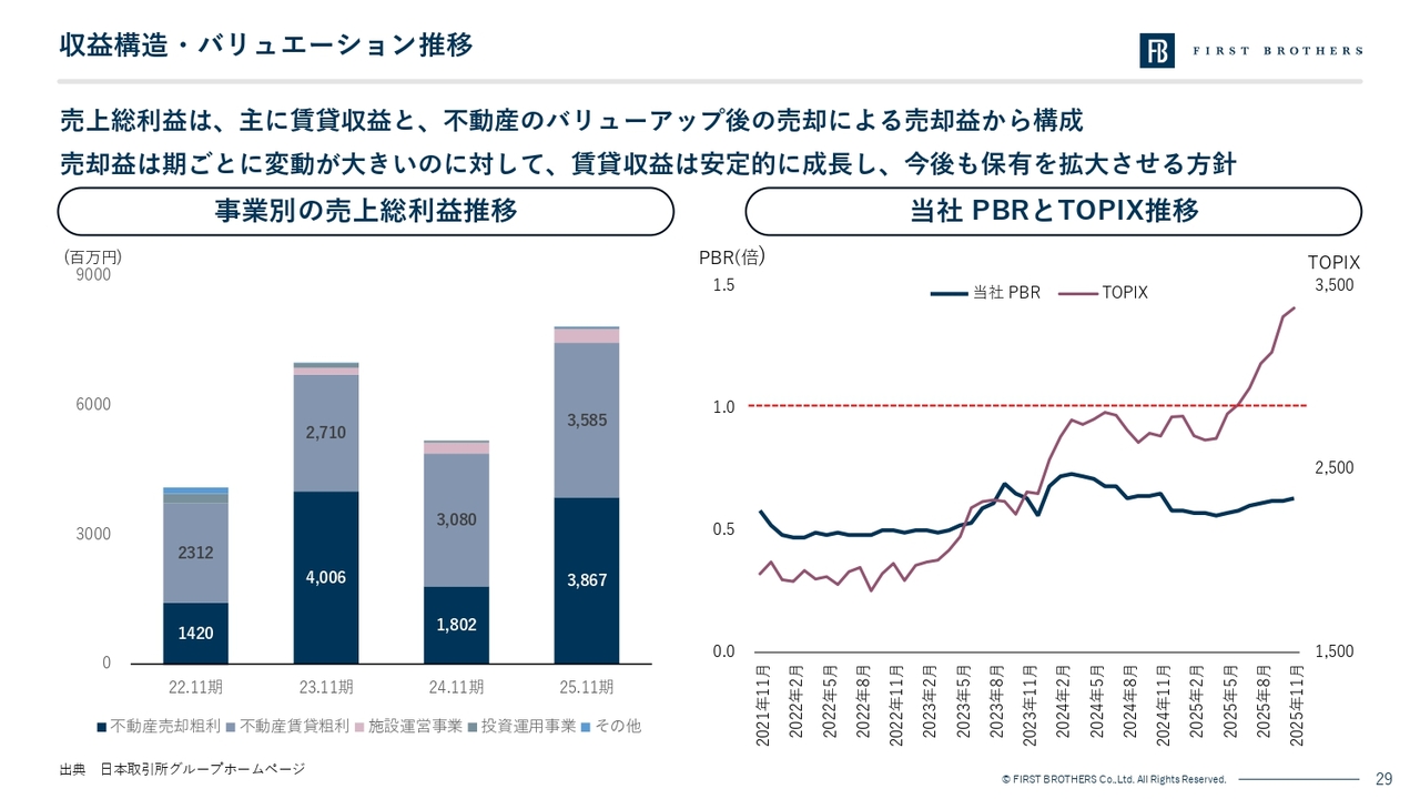 市場からの評価に対する当社の現状認識と、それに対する対応についてです。まず左側の事業別の売上総利益推移のグラフです。濃い青色が不動産売却益、薄いグレーが賃貸収益です。ご覧のとおり、当社の利益構造は、安定的に積み上がる賃貸収益をベースとしつつ、その上にボラティリティ(変動)の大きい売却益が乗るかたちとなっています。