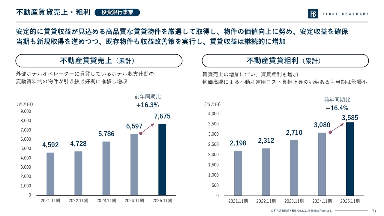 主力である投資銀行事業(賃貸不動産投資)においては、戦略的な物件売却による売却益の計上に加え、ポートフォリオの質の向上により賃貸収益が順調に伸長しました。その結果、投資銀行事業の売上総利益は35.8億円(前期比16.4パーセント増)となりました。