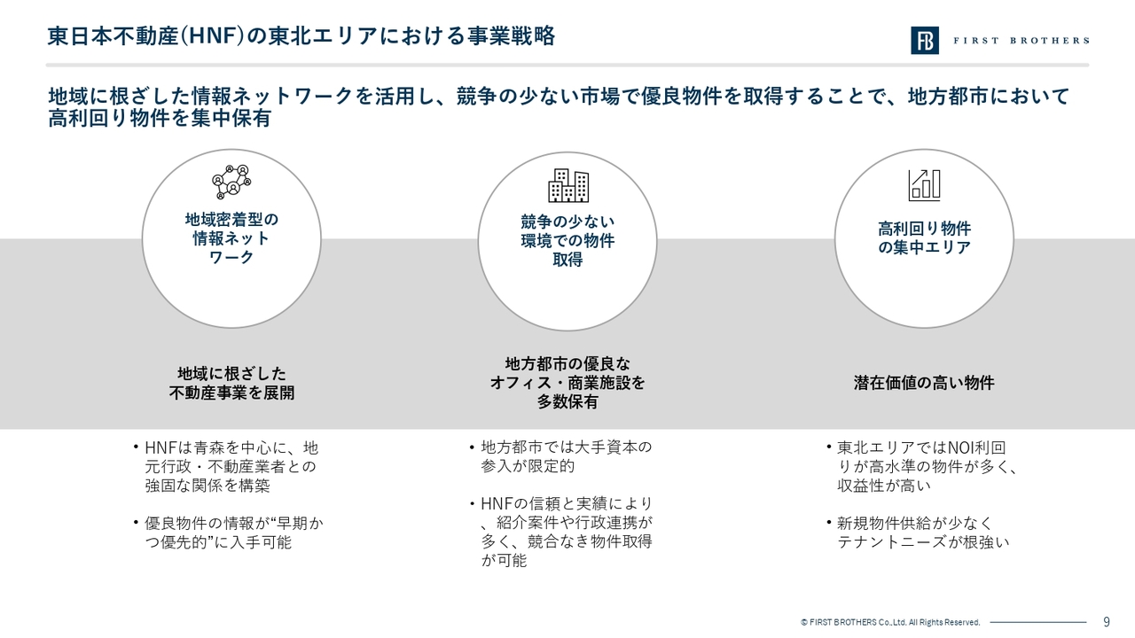 東北エリアにおけるHNFの事業戦略をご説明します。ポイントは、地域密着の情報ネットワークを活かし、競争の少ない環境で優良物件を取得、そして高利回り物件を集中的に保有することで、収益性の高いポートフォリオを築いている、という点です。