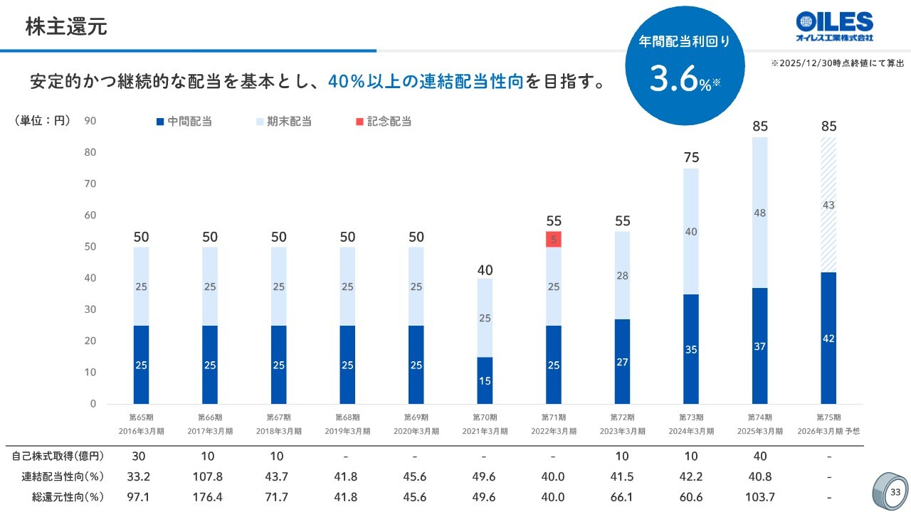 配当金については、2025年3月期に続き、2026年3月期も年間配当85円を予定しており、連結配当性向も40パーセント以上を目標としています。また、自己株式の取得については、内部留保や市場環境を総合的に勘案し、機動的に実施しています。