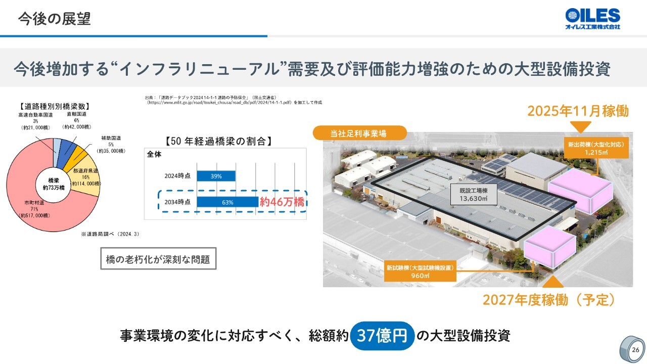 坂入:続いて、免震・制震装置についてご説明します。当社では、現在唯一の免震・制震装置の工場である足利事業所に対し、総額約37億円の大型設備投資を進めています。近年、橋の老朽化が深刻な問題となっており、2024年時点で設置から50年を経過した橋梁の割合は約39パーセント、さらに10年後には63パーセントを超えると予想されています。