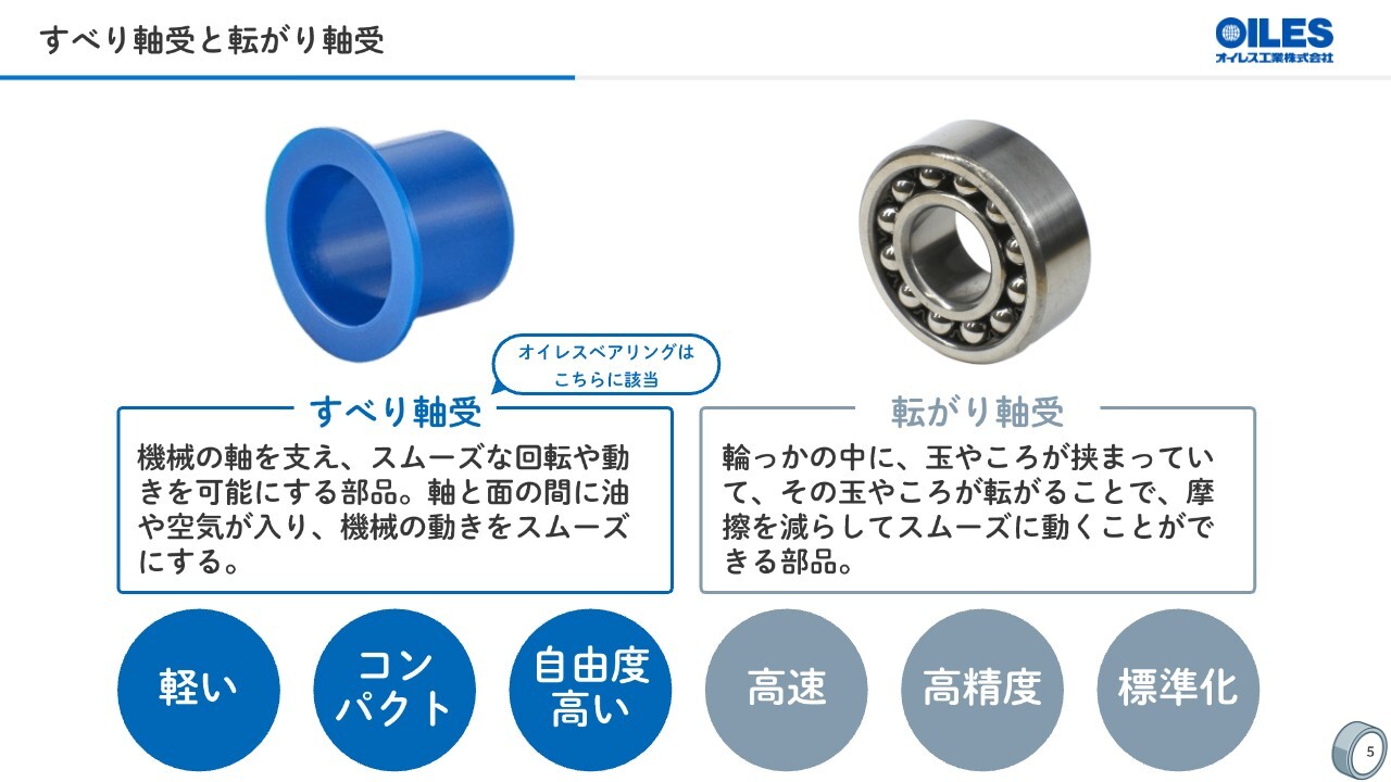 坂入:軸受には大きく分けて2種類あります。1つ目は、当社のオイレスベアリングも該当する「すべり軸受」です。軸がすべって動くタイプで、軽量かつコンパクトなのが特徴です。