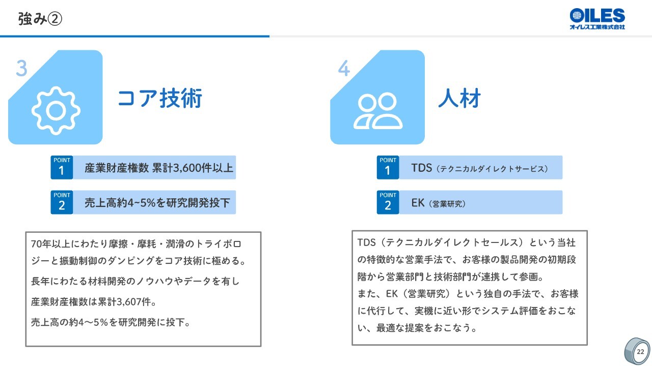 坂入:本日のポイントをまとめます。オイレス工業は、独自の摩擦・摩耗・振動の技術を強みに、多様な事業ポートフォリオを展開し、さまざまな産業分野での社会課題解決に貢献してきました。半導体やEV、インフラ分野などの成長市場への積極的な投資とグローバルな事業展開を通じて、今後もさらなる飛躍を目指します。