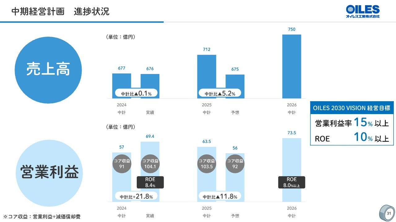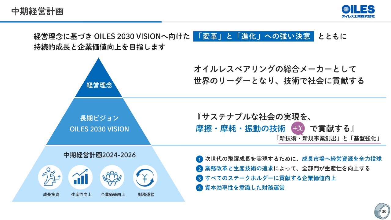 坂入:中期経営計画についてご説明します。当社は「技術で社会に貢献する」という経営理念を軸に、持続的な企業価値向上の実現を目指しています。そのための新たな長期ビジョンとして、「OILES 2030 VISION」を策定しました。