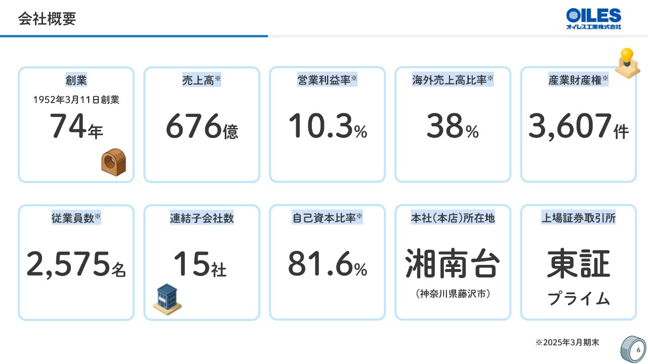 坂入:当社は来年3月で創業75周年を迎えます。2025年3月期におけるグループ全体の売上高は676億円、連結子会社数は15社、従業員数は約2,600名です。海外売上高比率は約4割の38パーセントとなっています。