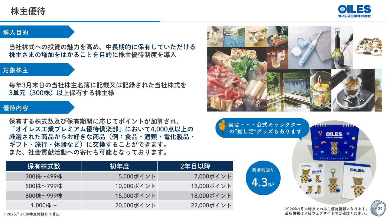 坂入:毎年3月末時点で300株以上を保有されている株主さまにポイントを付与し、「オイレス工業プレミアム優待倶楽部」で4,000点以上の商品の中から交換いただけます。生活用品や体験型ギフトのほか、社会貢献への寄付にもご利用可能です。