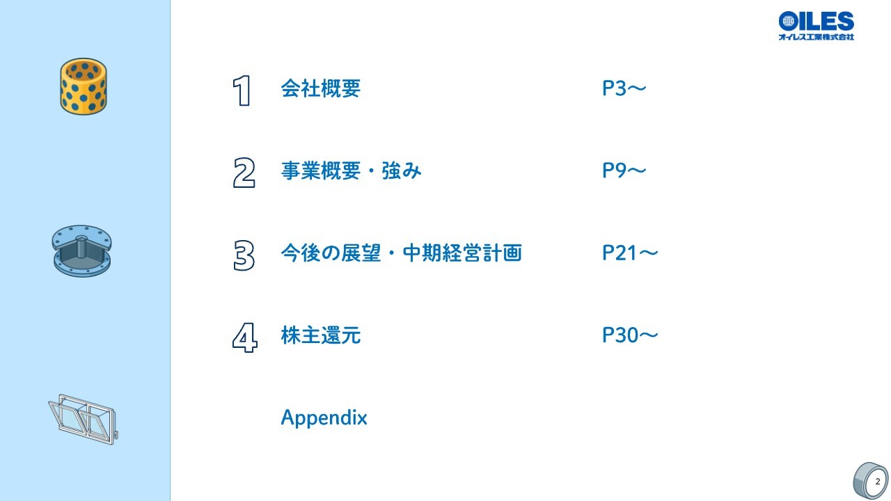 佐藤美樹氏(以下、佐藤):みなさま、こんにちは。本日はお忙しい中、オイレス工業株式会社の個人投資家向け説明会をご視聴いただき、誠にありがとうございます。私は、本日司会を務めますフリーアナウンサーの佐藤美樹と申します。本日は、オイレス工業株式会社代表取締役社長の坂入良和さまにお越しいただいています。よろしくお願いします。