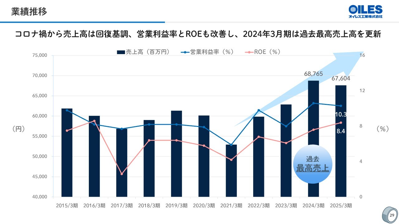 2024年度は、過去最高には至らないものの、中期経営計画で定めた目標とほぼ同水準の売上を達成し、順調に推移しています。また、営業利益率は、ここ2年ほどは10パーセントを超える水準を維持しており、収益性の面でも安定した成長を続けています。加えて、ROEも8パーセント以上を目指し、着実に取り組みを進めています。