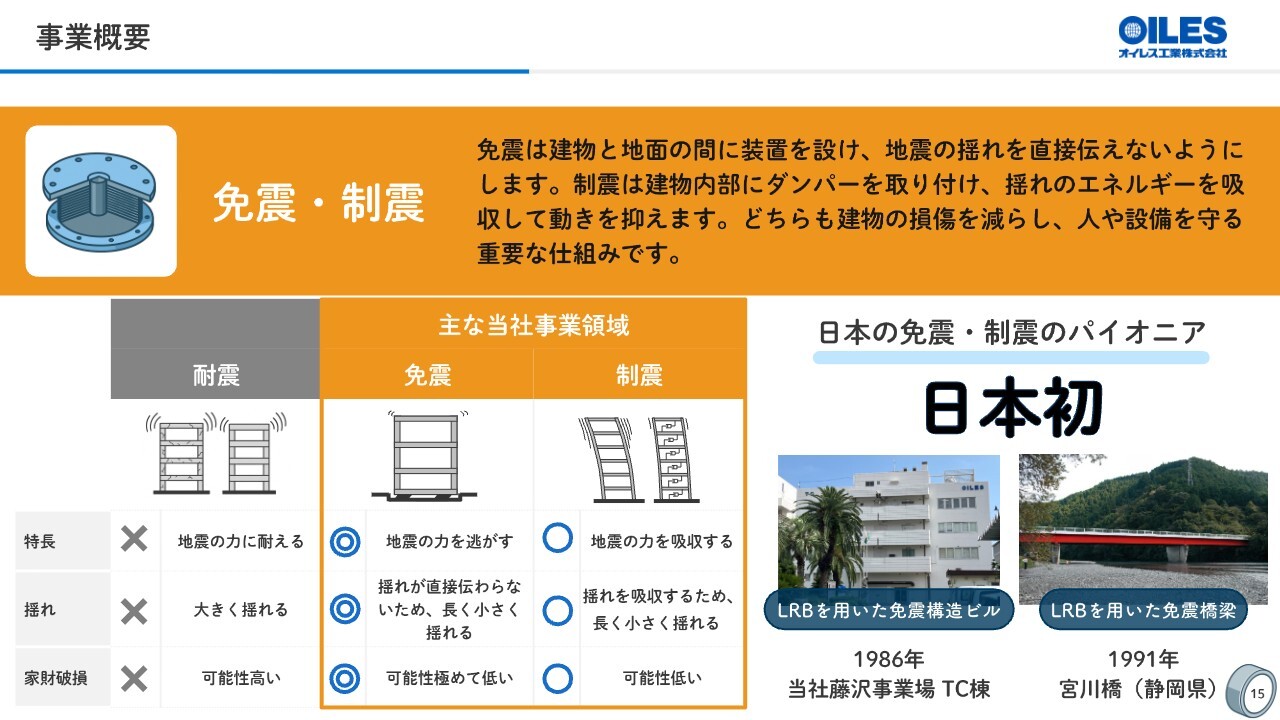 世の中には耐震マンションなど、「耐震」と名の付くもので建物自体を地震に耐える構造にするものもありますが、当社の主な事業領域としては、地震の力を逃がしたり吸収したりするものと覚えていただければと思います。
