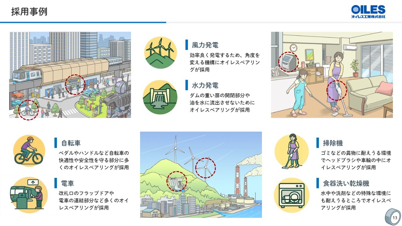 坂入:こちらのスライドでお示ししたとおり、さまざまな場所でご採用いただいています。油を差さなくてもよいということは、人の手がかけにくい場所でも使えるということで、メンテナンスも必要ありません。