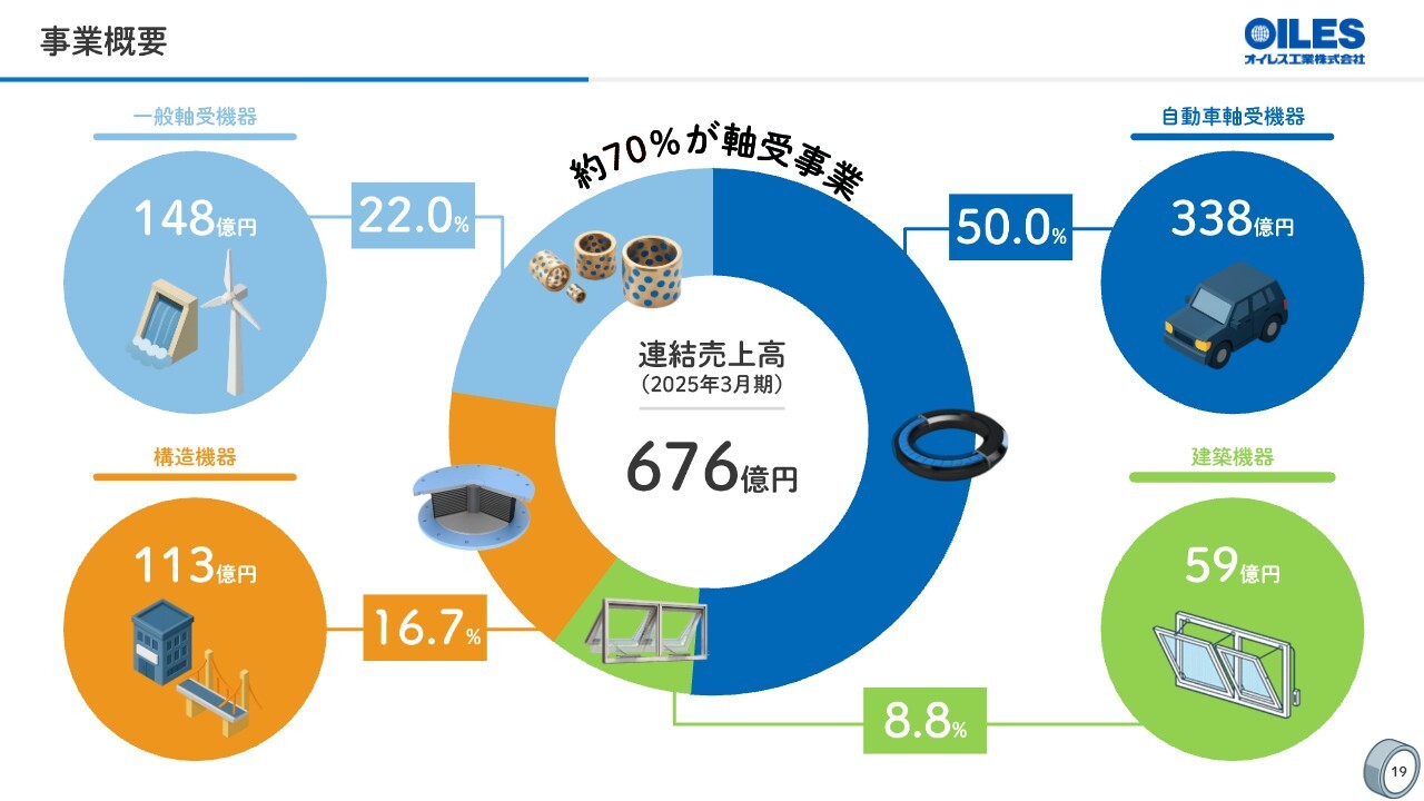2025年3月期の売上高676億円のうち、約70パーセントを軸受が占めています。全体のうち半分は、先ほどご説明したとおり、自動車向けの軸受です。一方、残りの半分は一般軸受、免震・制震装置、排煙・換気用窓開閉装置が占めています。