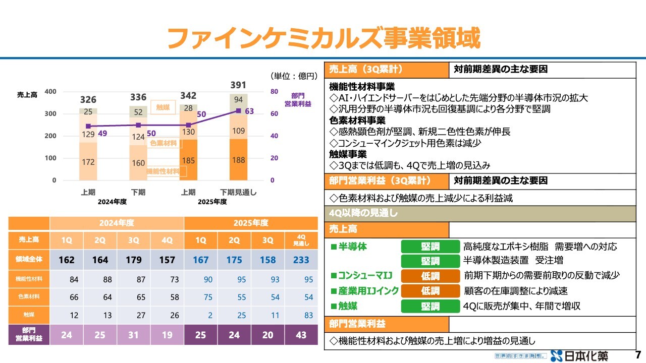 機能性材料事業では、AIやハイエンドサーバーをはじめとした先端分野の半導体市況が拡大しています。また、汎用分野の半導体市況も回復基調にあり、各分野で堅調に推移しているため、現時点での2025年度の売上高は過去最高を想定しています。