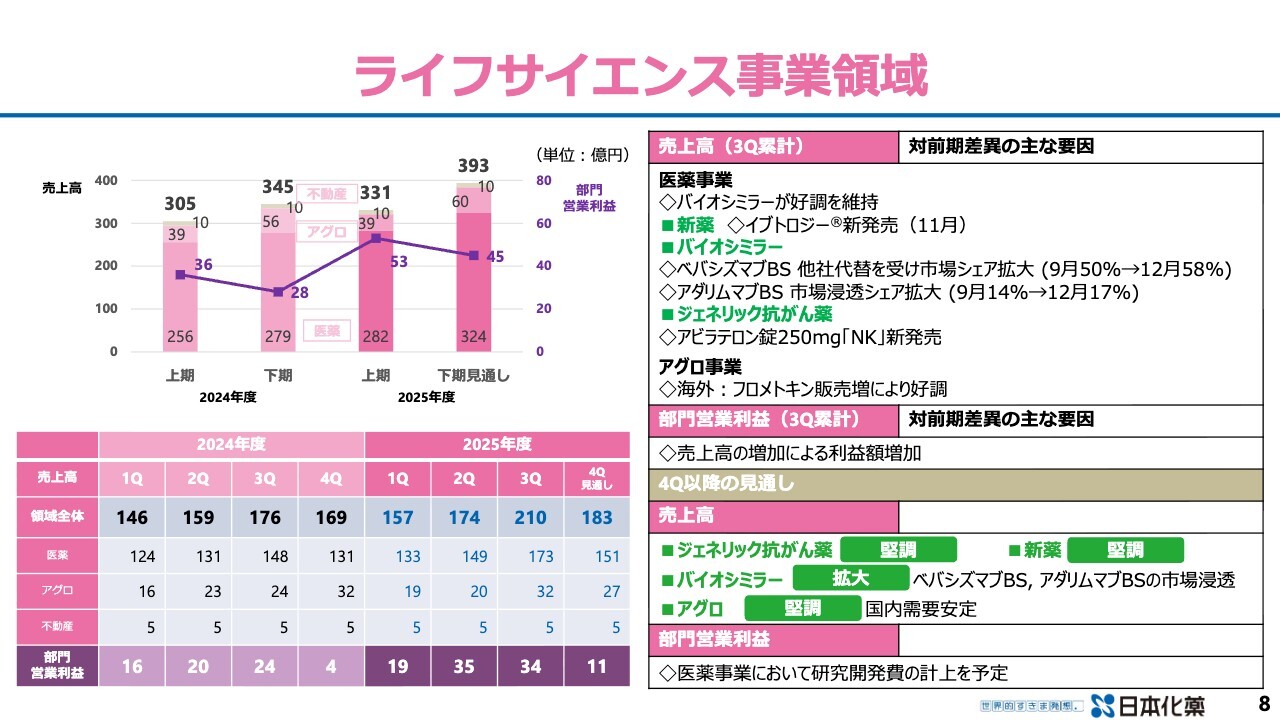 ライフサイエンス事業領域は、売上541億円のうちBS(バイオシミラー)が125億円を占め、前年同期比41億円増加し、非常に堅調に推移しています。