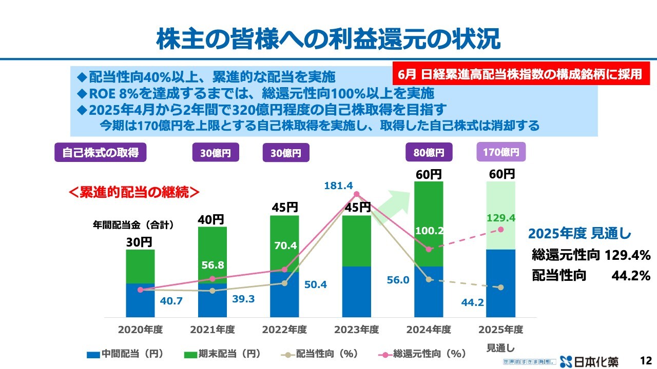 今期の見通しについて、総還元性向は129.4パーセント、配当性向は44.2パーセントとなる見込みです。配当金は昨年と同様、60円を予定しています。私からの発表は以上です。