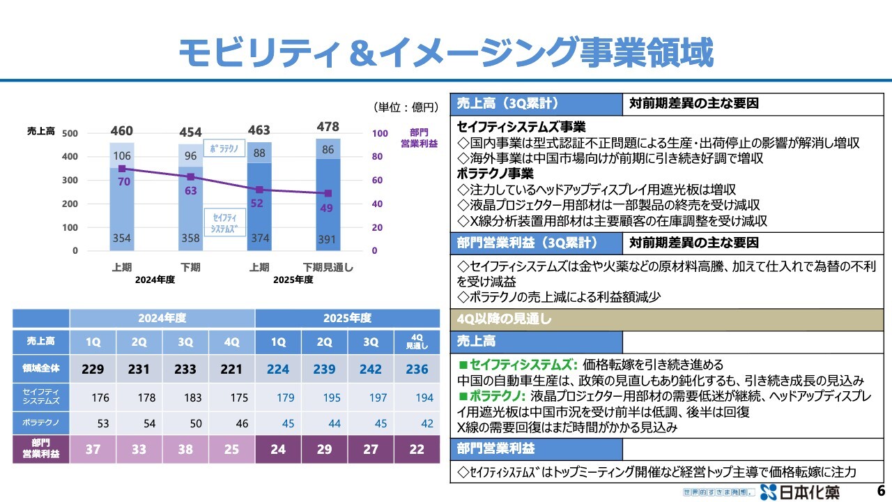 一方、モビリティ&イメージング事業領域とファインケミカルズ事業領域は、それぞれ前年同期比29億円、10億円の減益となりました。