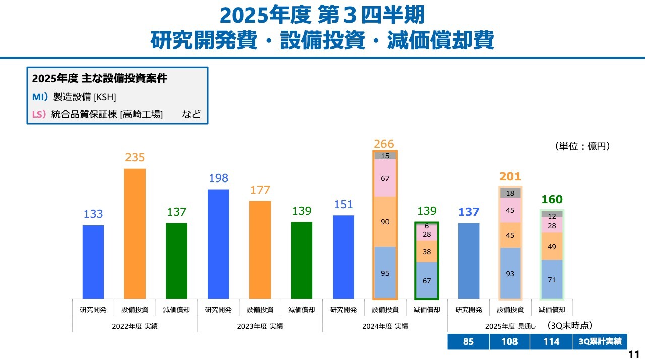 研究開発費・設備投資・減価償却費の状況です。スライドの棒グラフのうち、一番右側には2025年度第3四半期末の実績が最下段に記載されています。