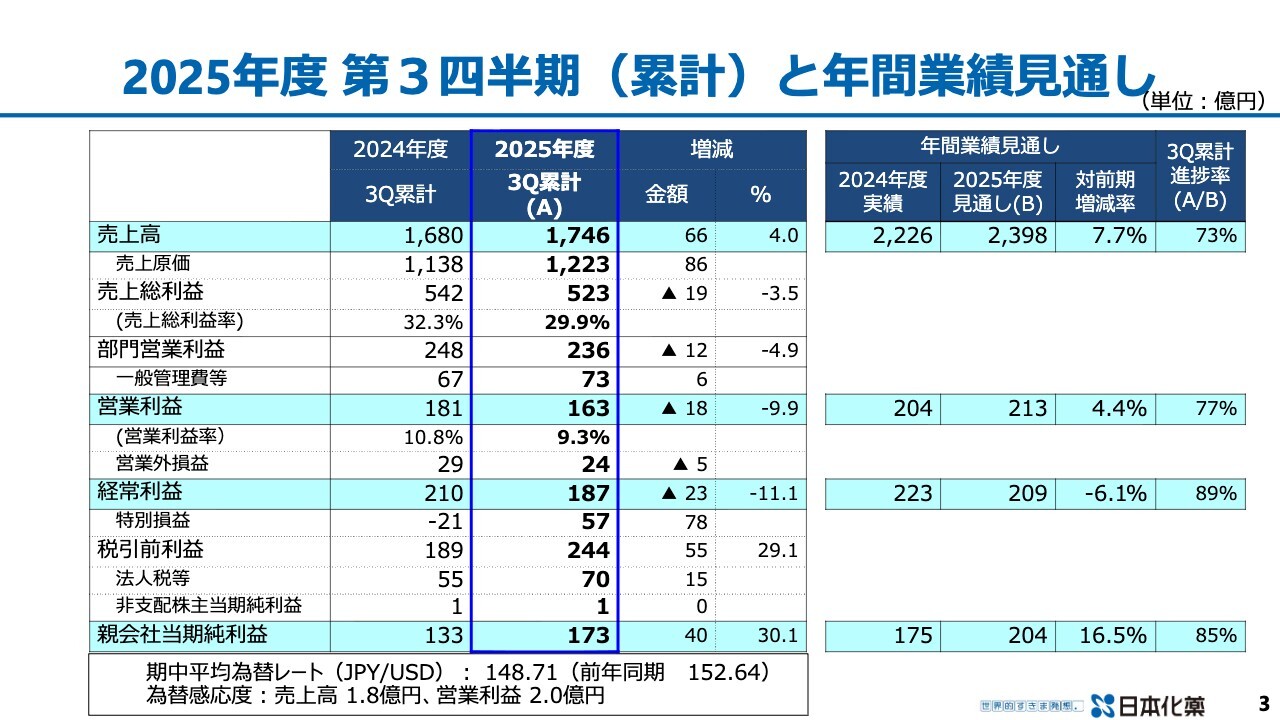 2025年度第3四半期の売上高は1,746億円です。売上総利益率が前年同期比約2.4ポイント低下したことに伴い、部門営業利益は236億円となりました。営業利益は163億円、経常利益は187億円、親会社当期純利益は173億円です。