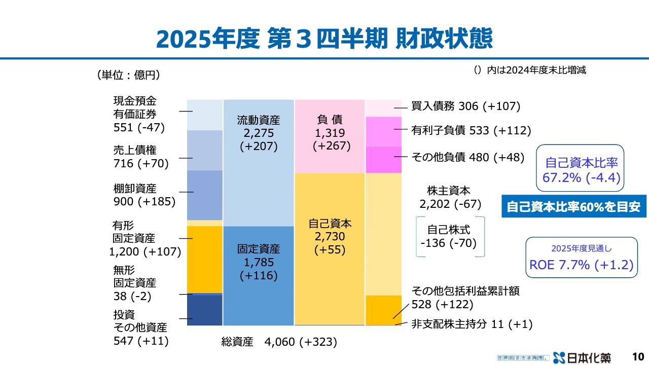 財政状態です。総資産は前年度末より323億円増加し、4,060億円となりました。主な増加要因は棚卸資産で、約185億円の増加となっています。また、固定資産は建物や機械などで約116億円増加し、1,785億円となりました。