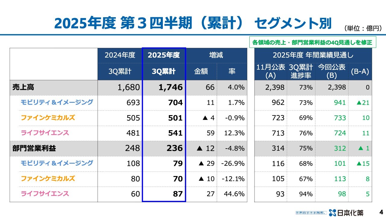 なお、ファインケミカルズ事業領域の触媒事業は事業特性上、第4四半期に売上が集中することがあるため、こちらも後ほどご説明します。また、モビリティ&イメージング事業領域は原料高騰や在庫調整の影響により、第4四半期は低調になる見通しです。