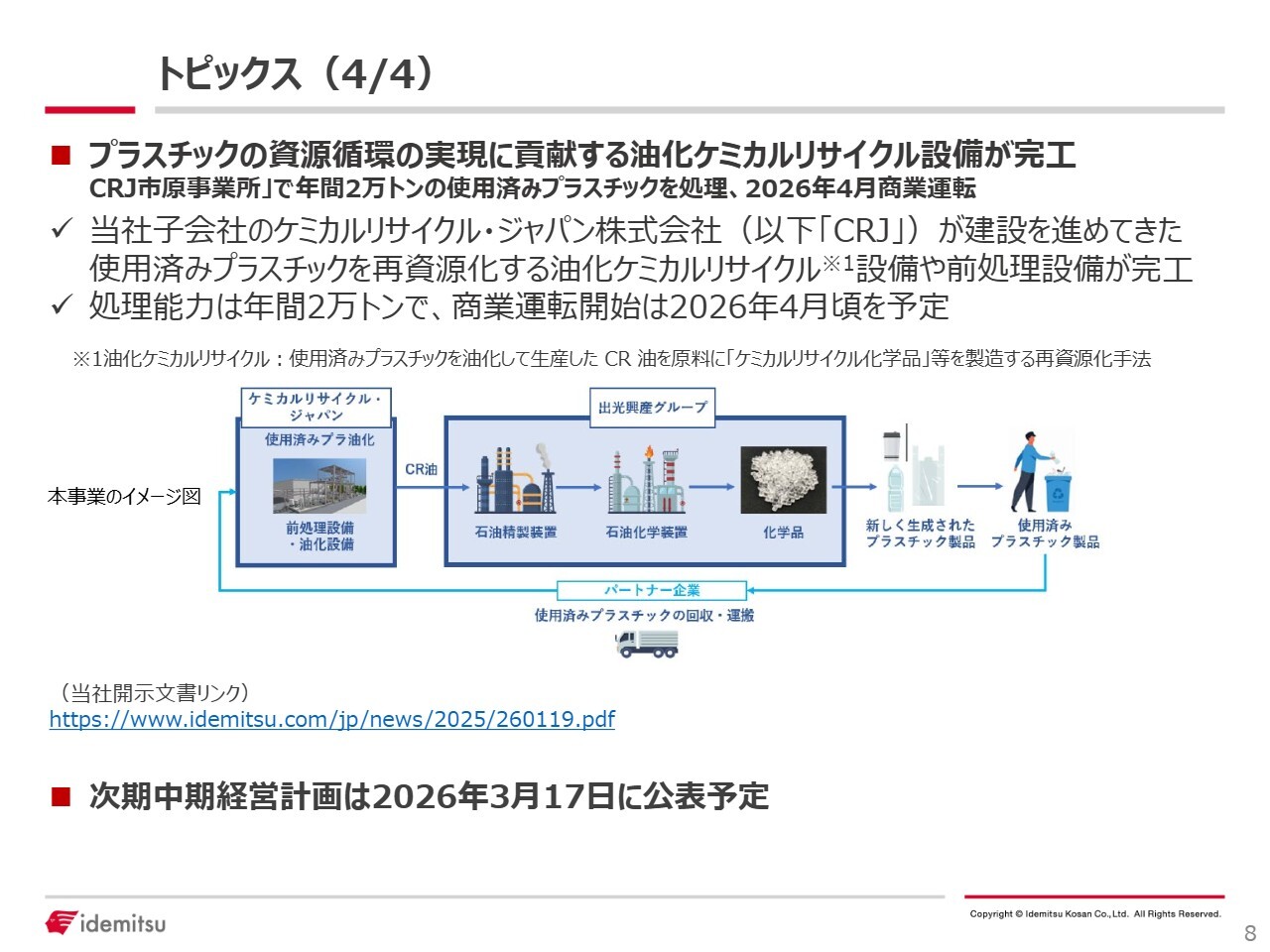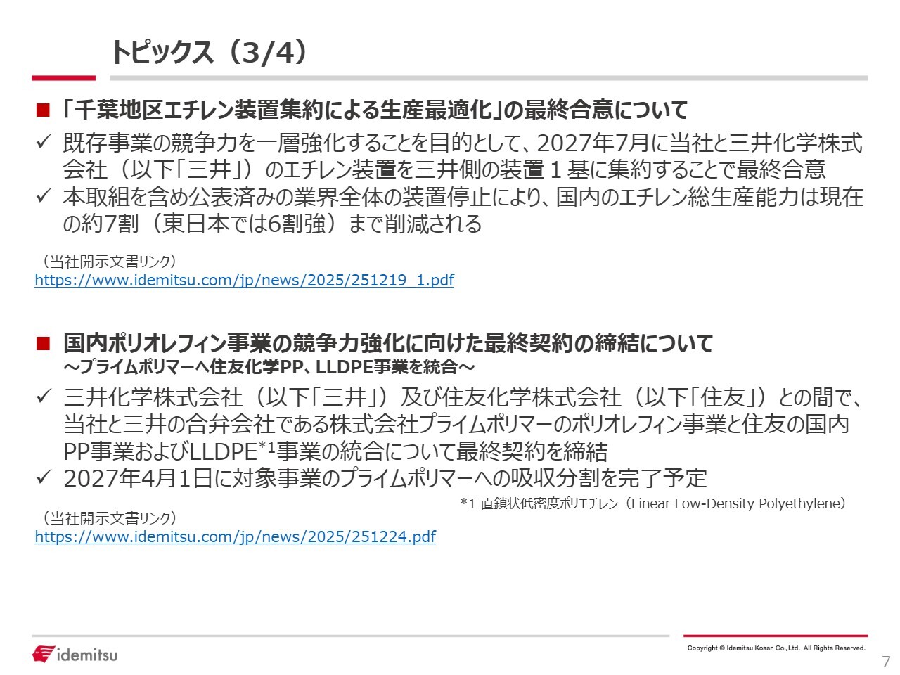 2025年12月19日のプレスリリースのとおり、三井化学株式会社(以下、三井化学)との間で「千葉地区エチレン装置集約による生産最適化」に関する最終合意を行い、エチレン装置は三井化学側の装置1基に集約することとなりました。