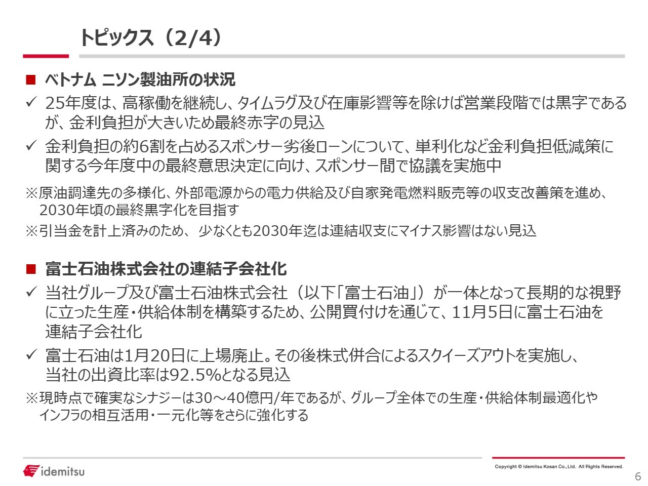 続いて、富士石油株式会社(以下、富士石油)についてです。当社グループおよび富士石油が一体となり、意思決定の迅速化と長期的視野に立った生産体制の構築を目的として、公開買付けを通じて11月5日に富士石油を連結子会社化しました。