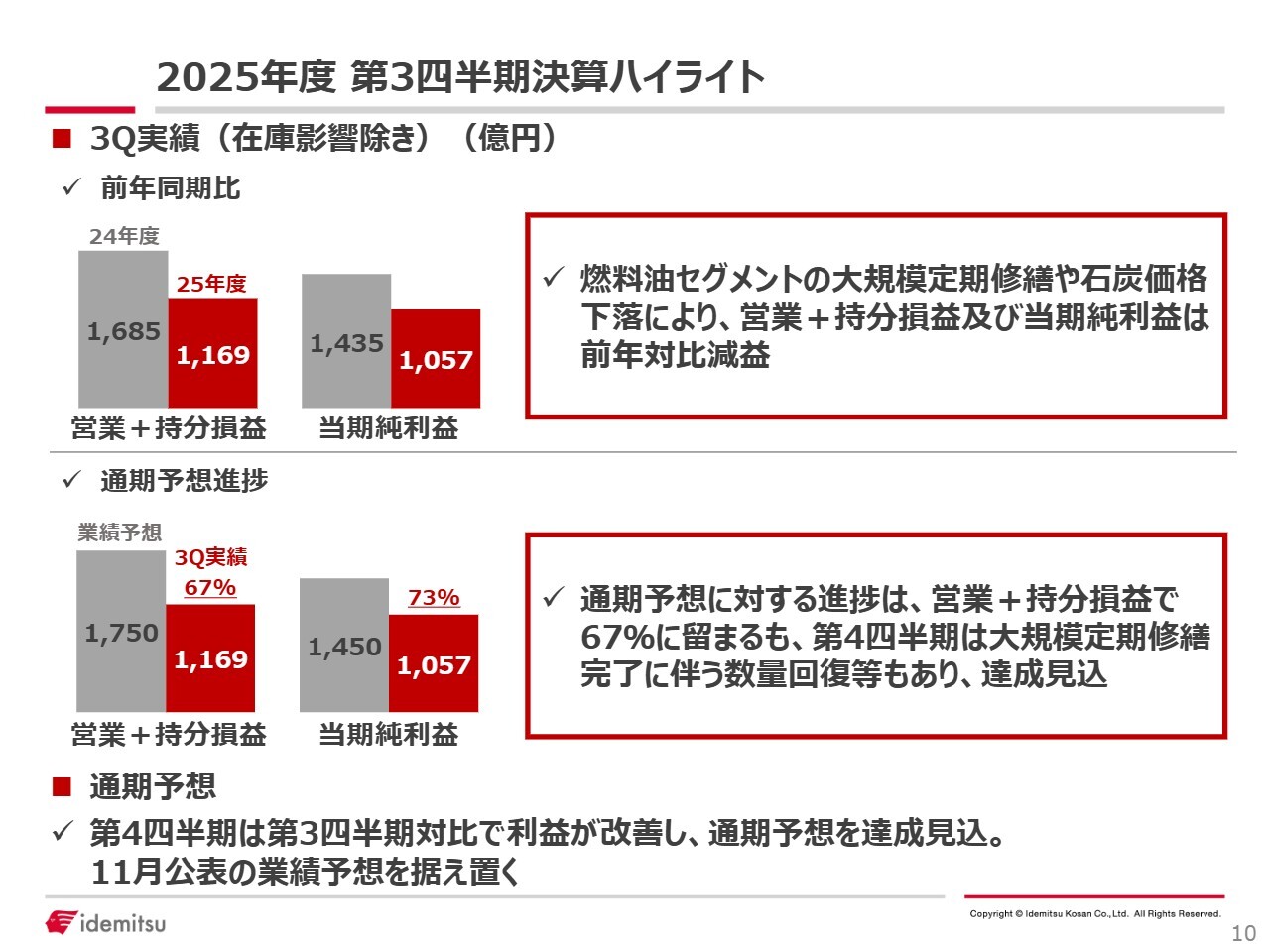 一見、進捗が不足しているように見えますが、これは第3四半期に愛知事業所が定期修繕に入ったために生産数量が減少したことによるものです。この点については、業績を立てる段階ですでに織り込み済みです。現在すべての定期修繕は完了しており、第4四半期には生産数量が回復してくる見込みです。