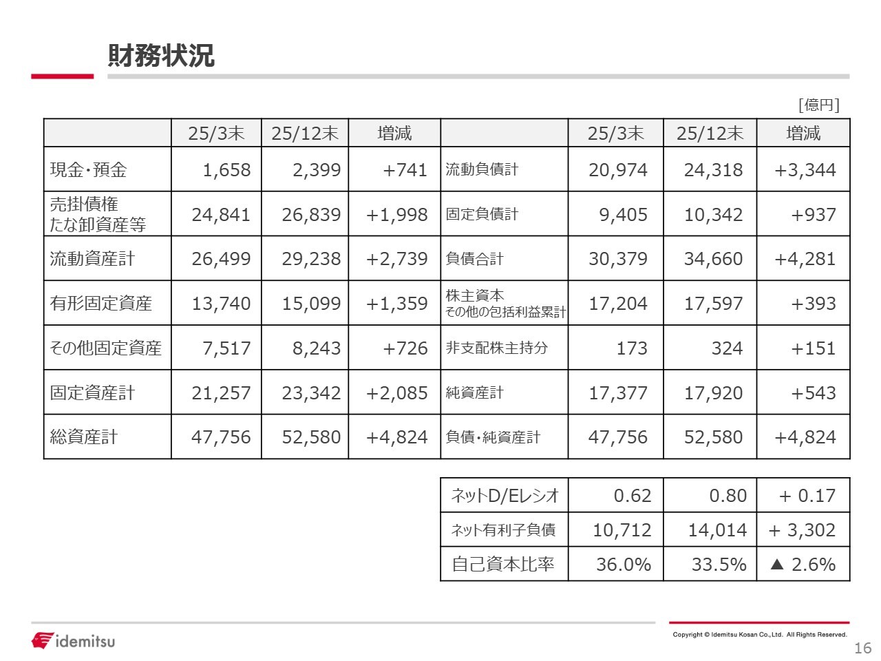 財務状況です。総資産は主に富士石油の連結化により前年度末比で4,824億円増加し、5兆2,580億円となりました。