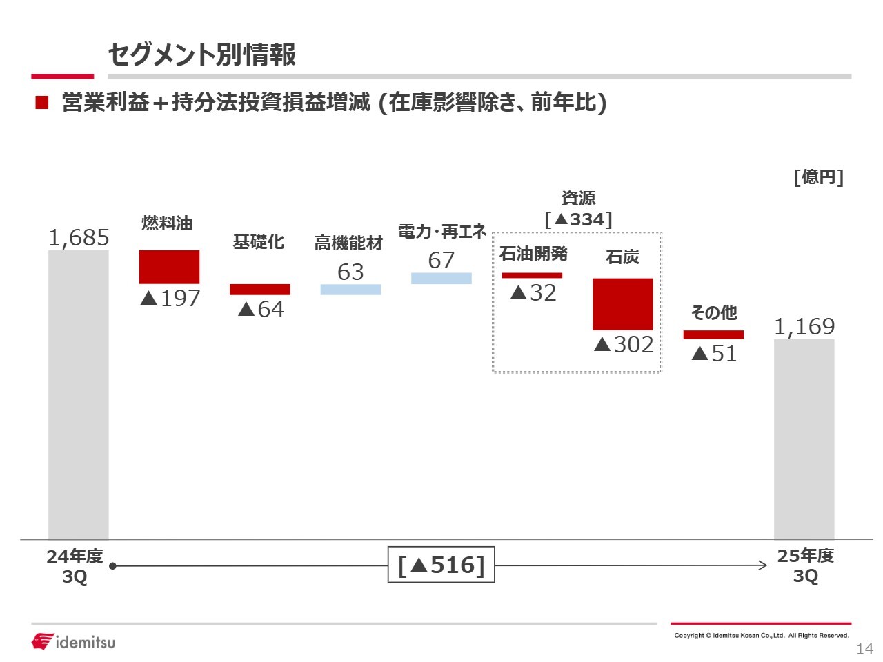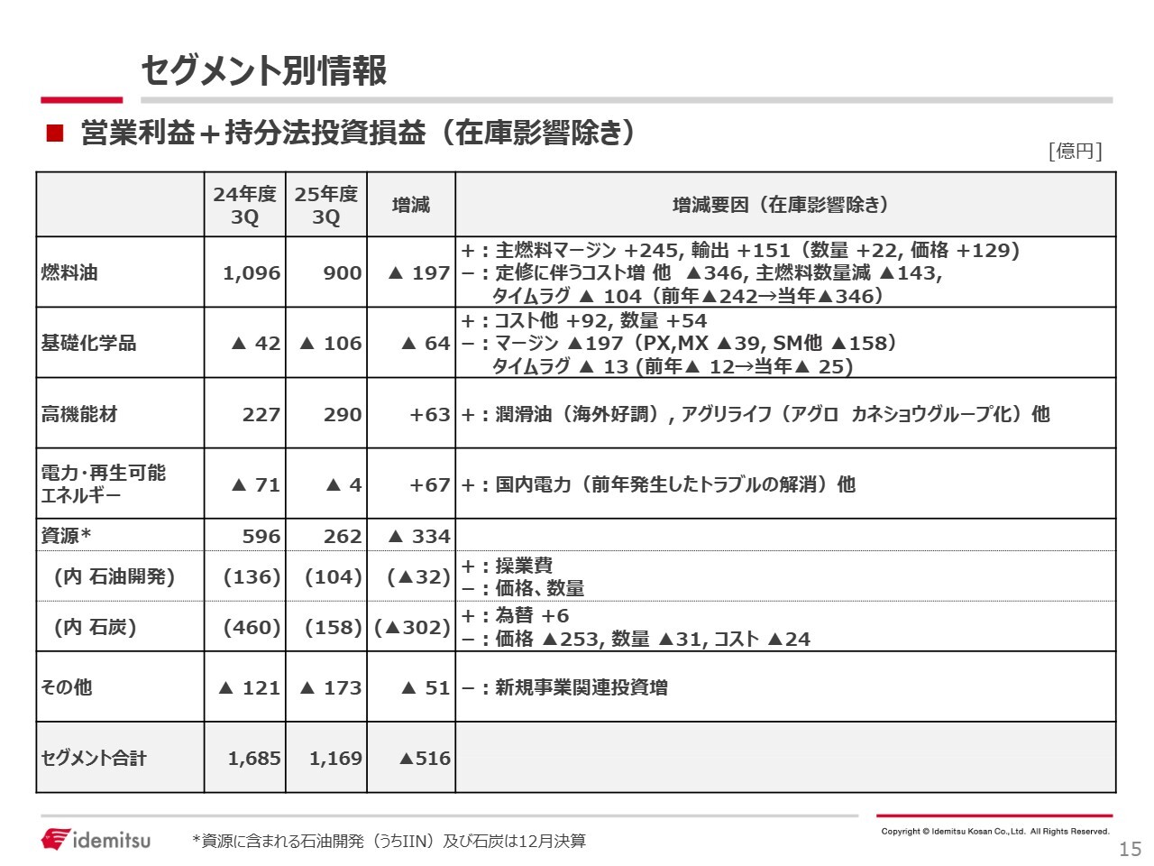 スライドは、在庫評価損益の影響を除いた実態ベースでの営業利益プラス持分法投資損益を、セグメント別に前年と比較したものです。前年比で516億円の減益となった要因は、主に燃料油セグメント、基礎化学品セグメント、および資源セグメントで発生しています。