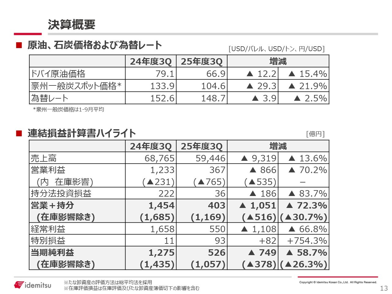 坂田貴志氏:出光興産株式会社常務執行役員CFOの坂田です。本日は2025年度第3四半期決算説明会にご参加いただき、誠にありがとうございます。みなさまには日頃より当社の事業活動にご理解とご支援を賜り、厚く御礼申し上げます。