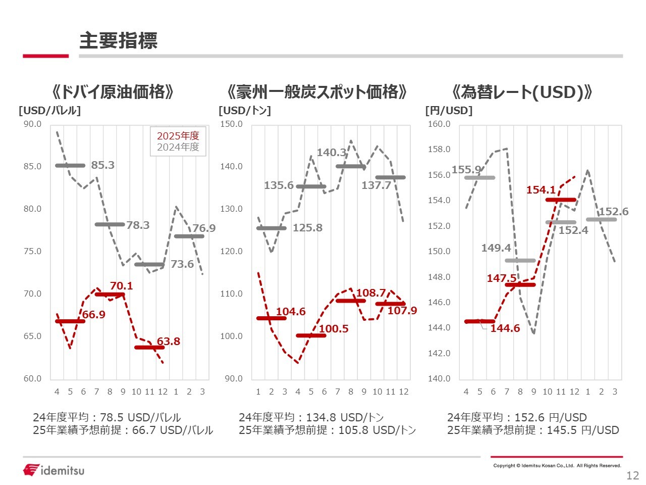 事業環境を示す主要指標です。ドバイ原油価格・豪州一般炭スポット価格・為替レート(USD)の推移を示しています。グレーが昨年の実績、赤が今年の実績です。