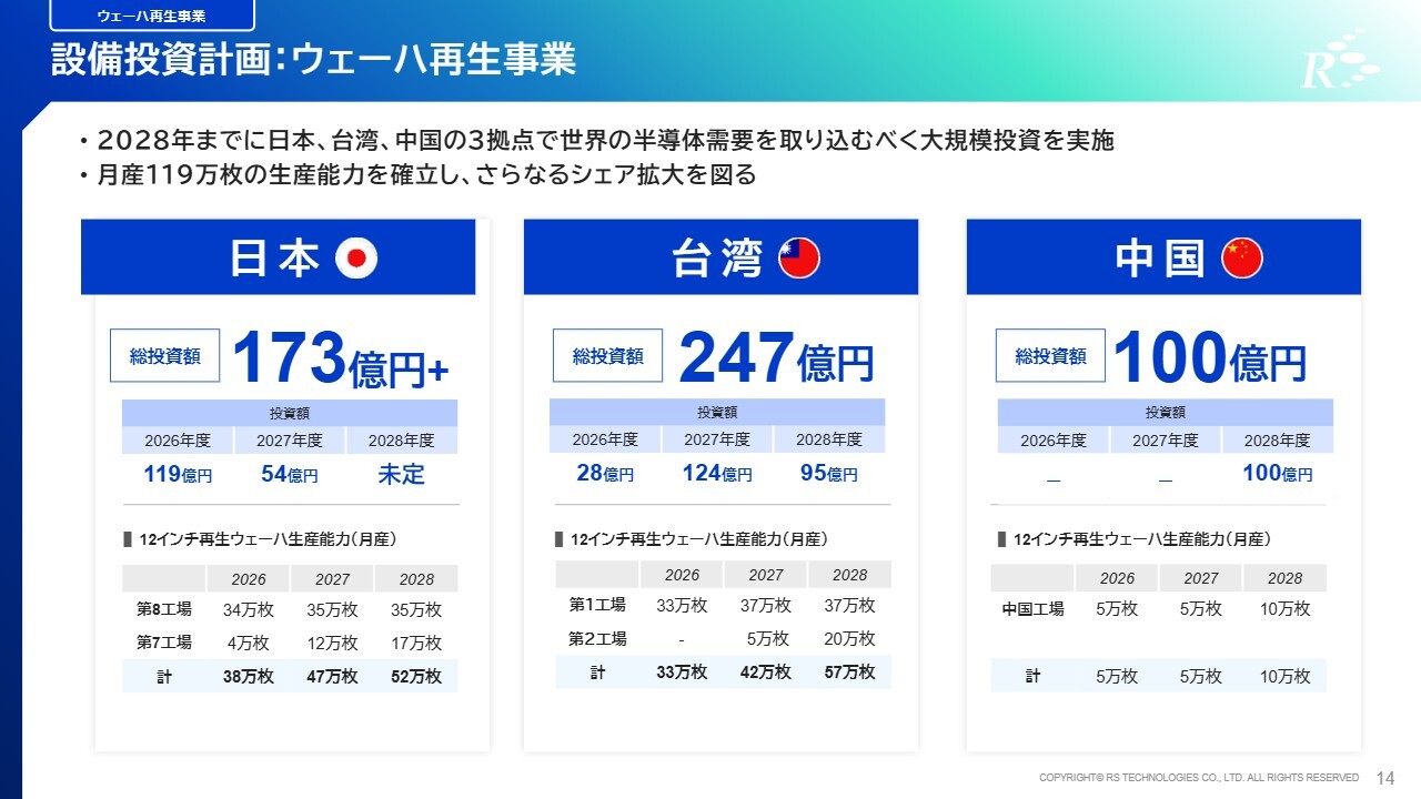 キャッシュ・アロケーションのスライドで示したとおり、この3ヶ年でウェーハ再生事業への大規模投資を計画しています。2028年までに日本、台湾、中国を合わせた月産生産枚数を約120万枚まで拡充する予定です。