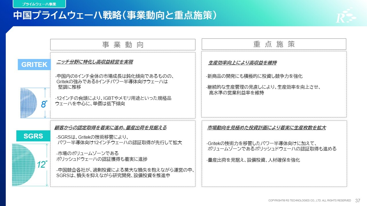 今後、中国の12インチ半導体の品質向上に伴い、顧客からのシリコン部材の品質要求も高まると思われます。ここでは、当社の高品質なシリコン部材が優位になると考えています。