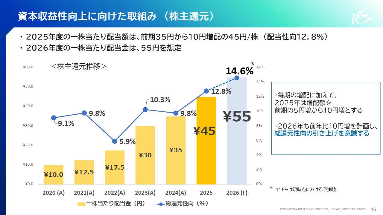 株主還元についてです。2025年度の1株当たり配当額は、業績などを総合的に勘案し、前期の35円から10円増配の45円としました。2026年度の1株当たり配当金は55円を想定しています。今後も、株主のみなさまへの還元を実施しながら事業を成長させていきたいと考えています。