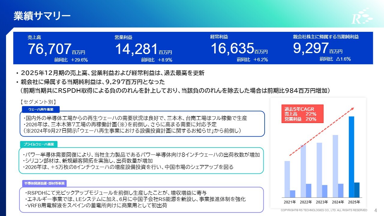 RS Technologies、増収増益で売上・営業利益・経常利益が過去最高 再生ウェーハ好調に推移