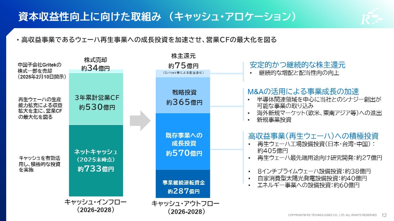 キャッシュ・アロケーションについてです。今後、企業価値向上に向けてキャッシュを有効活用し、資本収益性の向上を図る計画です。特にこの3年間で、高収益事業であるウェーハ再生事業への設備投資、および最先端用途に対応するための研究開発への投資を予定しています。