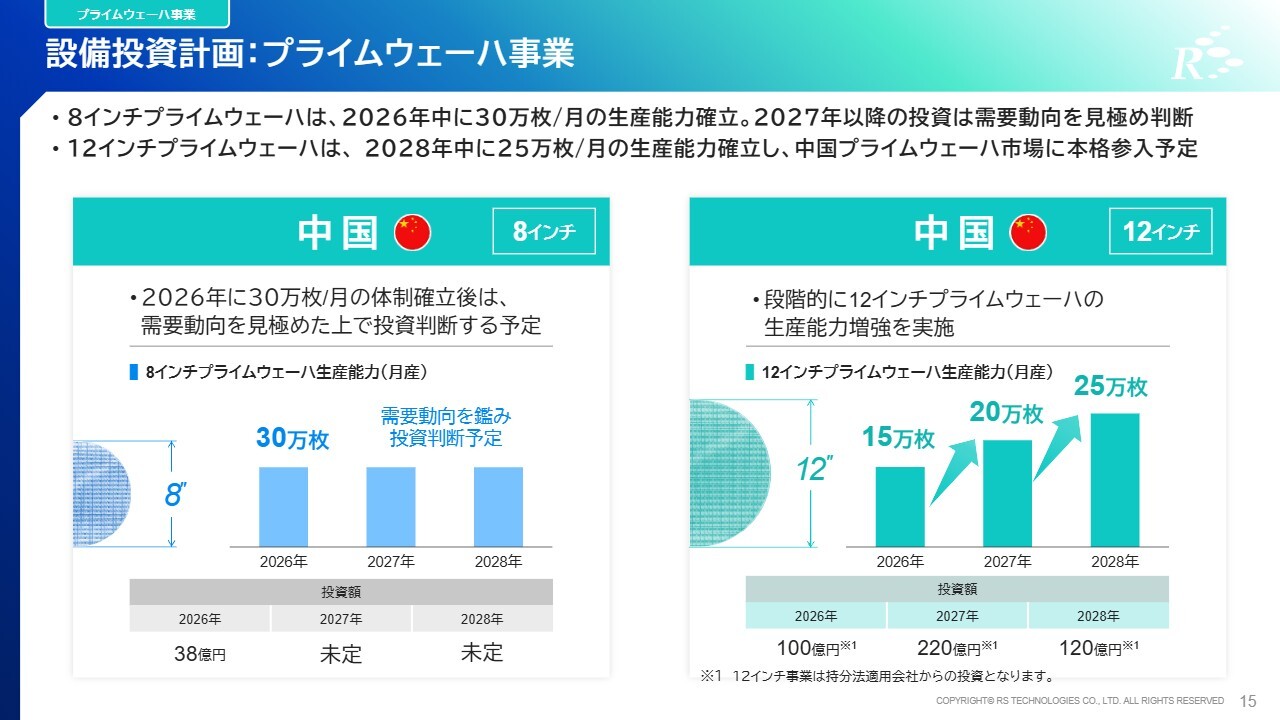 12インチは、現在の生産能力である月産11万枚から、2026年中に15万枚へと増加させる予定です。12インチ事業は持分法適用会社で展開しており、スライドに記載している投資額はSGRSからの投資予定額で、当社からの持ち出しは含まれていません。