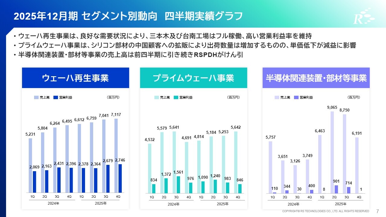 今期のセグメント動向です。ウェーハ再生事業は、売上高が275億2,900万円で前年比15.7パーセント増、営業利益が101億6,700万円で前年比12.2パーセント増となりました。2025年は、三本木工場と台南工場を合わせて月産5万枚の増産投資を実施し、計画どおり下期からフル稼働で生産を行えたことが増収増益の主な要因です。