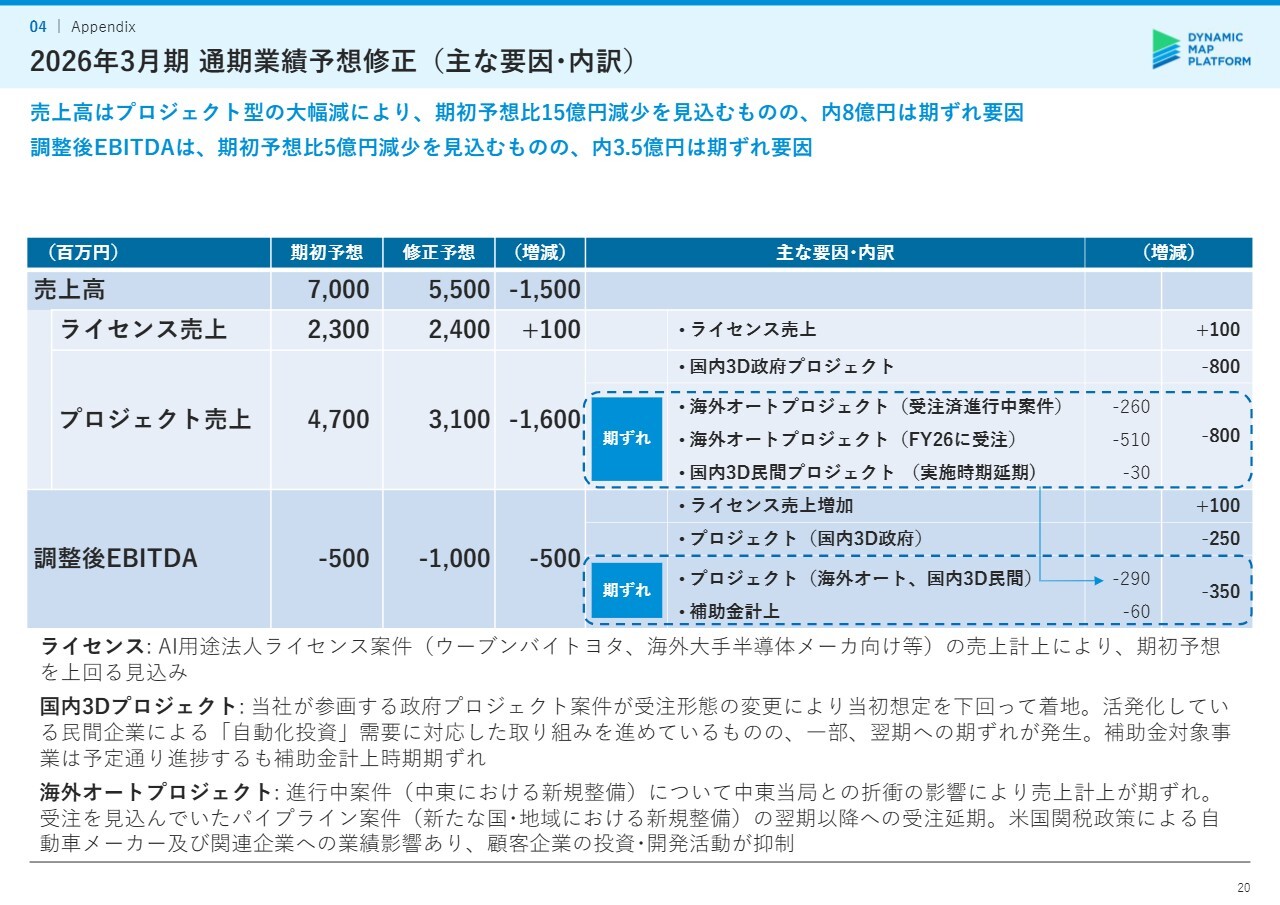 内訳ですが、8億円分が米国関税政策の影響を受け、海外オートプロジェクトを中心に期ずれが発生しています。 その他に期ずれ要因以外では、国内3D政府プロジェクト「デジタルライフライン」の受注規模縮小により、8億円の減少となりました。想定していた政府プロジェクト自体はすべてきちんと受注していますが、NEDO側のプロジェクト推進体制の変更が当社の売上規模に大幅な影響を与えたものです。