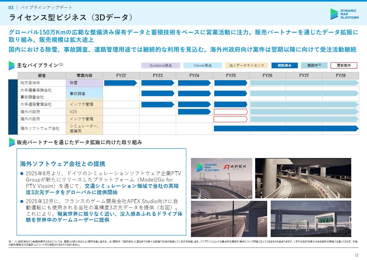 1つ目は、ライセンス型の3Dデータビジネスです。交通シミュレーション領域において、販売パートナーを通じたデータ拡販とデータ販売を開始していますが、販売規模の拡大は途上と評価しています。国内では、除雪や道路管理用途で顧客数が継続的に増加し、利用が促進されています。