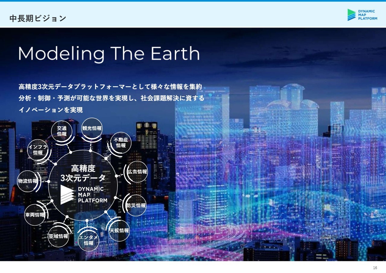 当社の中長期ビジョンです。「Modeling the Earth」の実現に向けて、DMPグループ一丸となり、中長期で事業を成長させていきたいと考えています。引き続きご支援を賜りますようお願いします。どうぞよろしくお願いします。