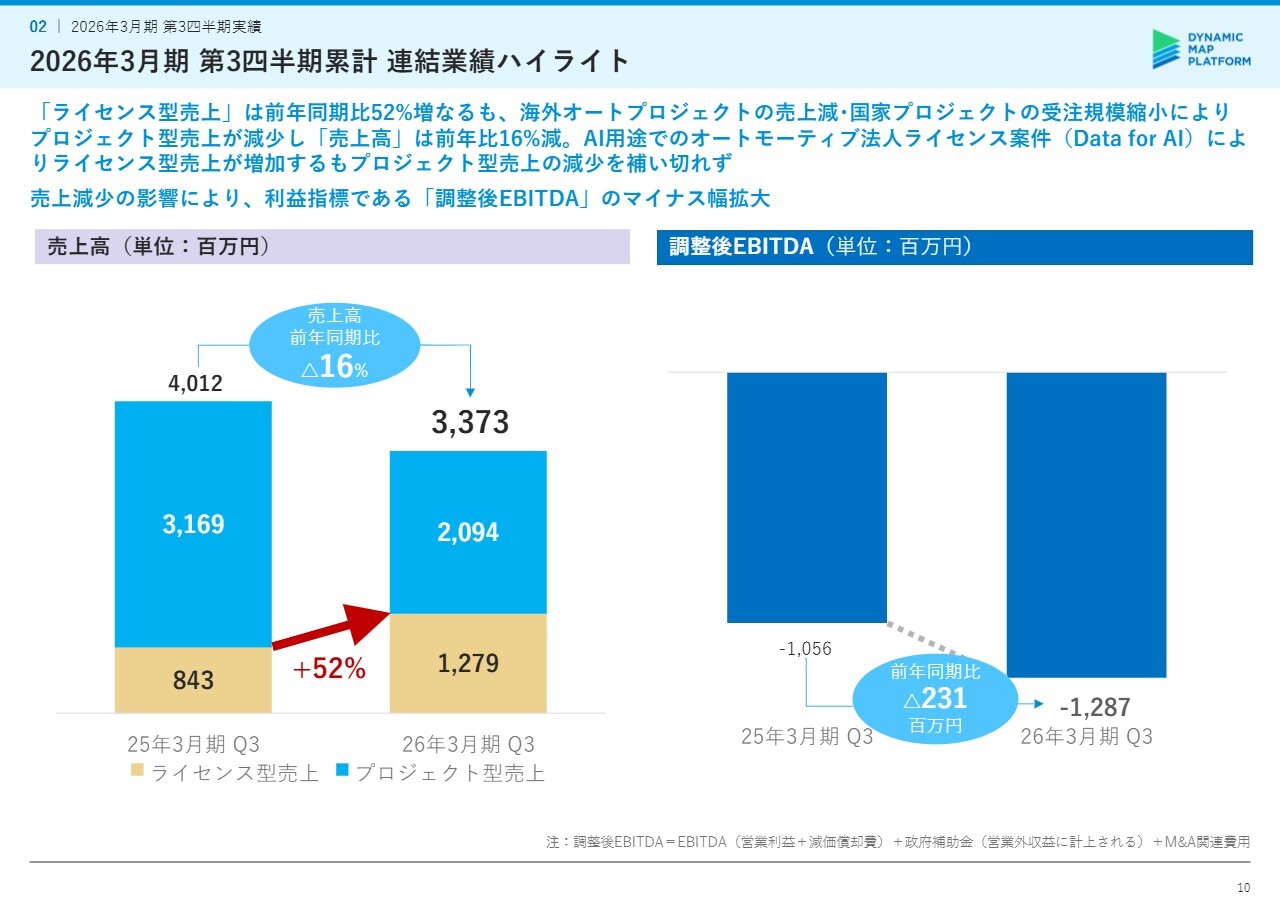このスライドでは、業績ハイライトをまとめています。2026年3月期第3四半期累計の売上高は前年同期比で減収となりました。ライセンス型は堅調に伸び、前年同期比50パーセント増となりましたが、プロジェクト型は減収となっています。